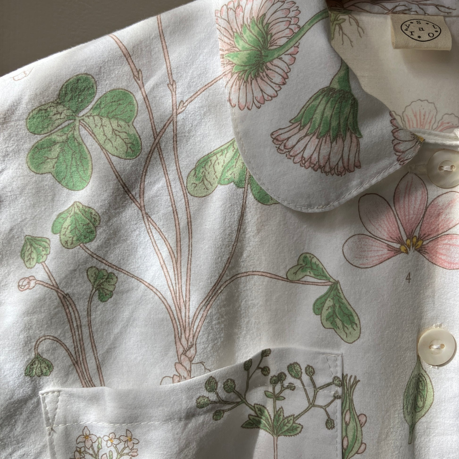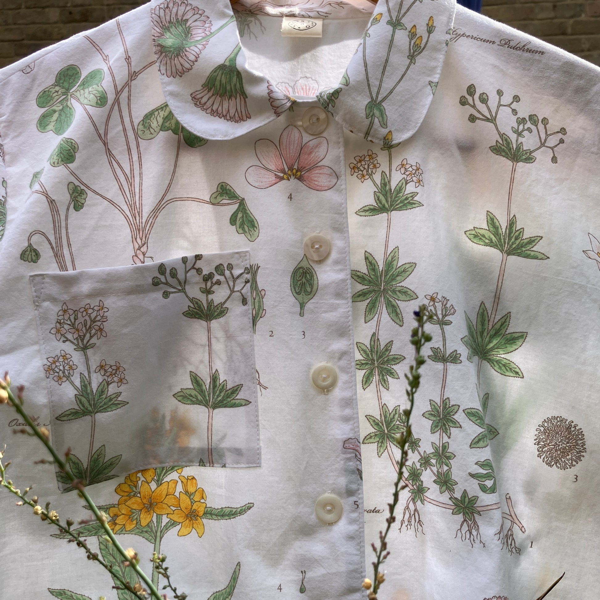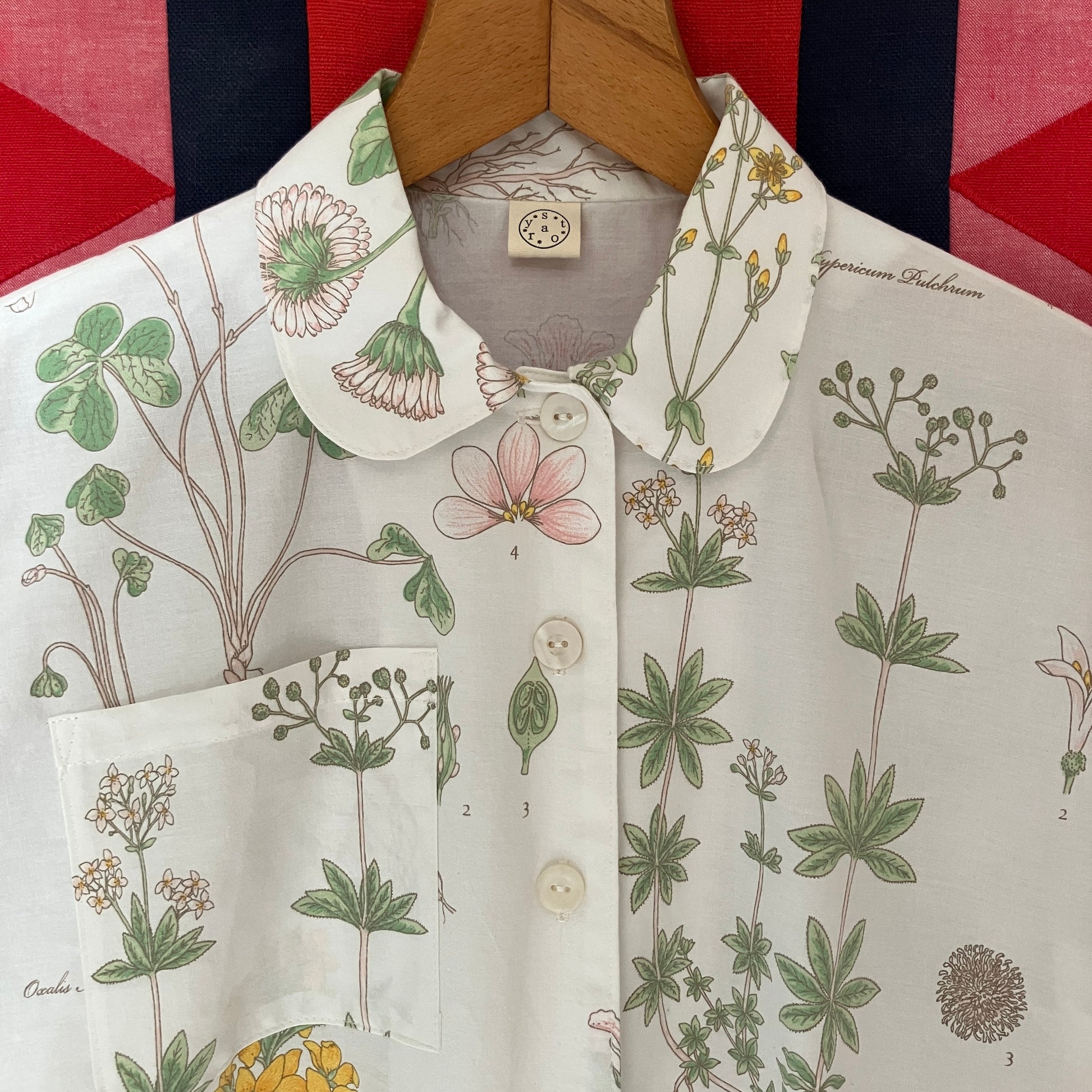 A few people mentioned that they'd like me to come up with a flat-fronted shirt with no gathers. So I simplified one of my patterns to make this boxy, gather- and yoke-free shirt from some pretty botanical-print reclaimed cotton bedding.