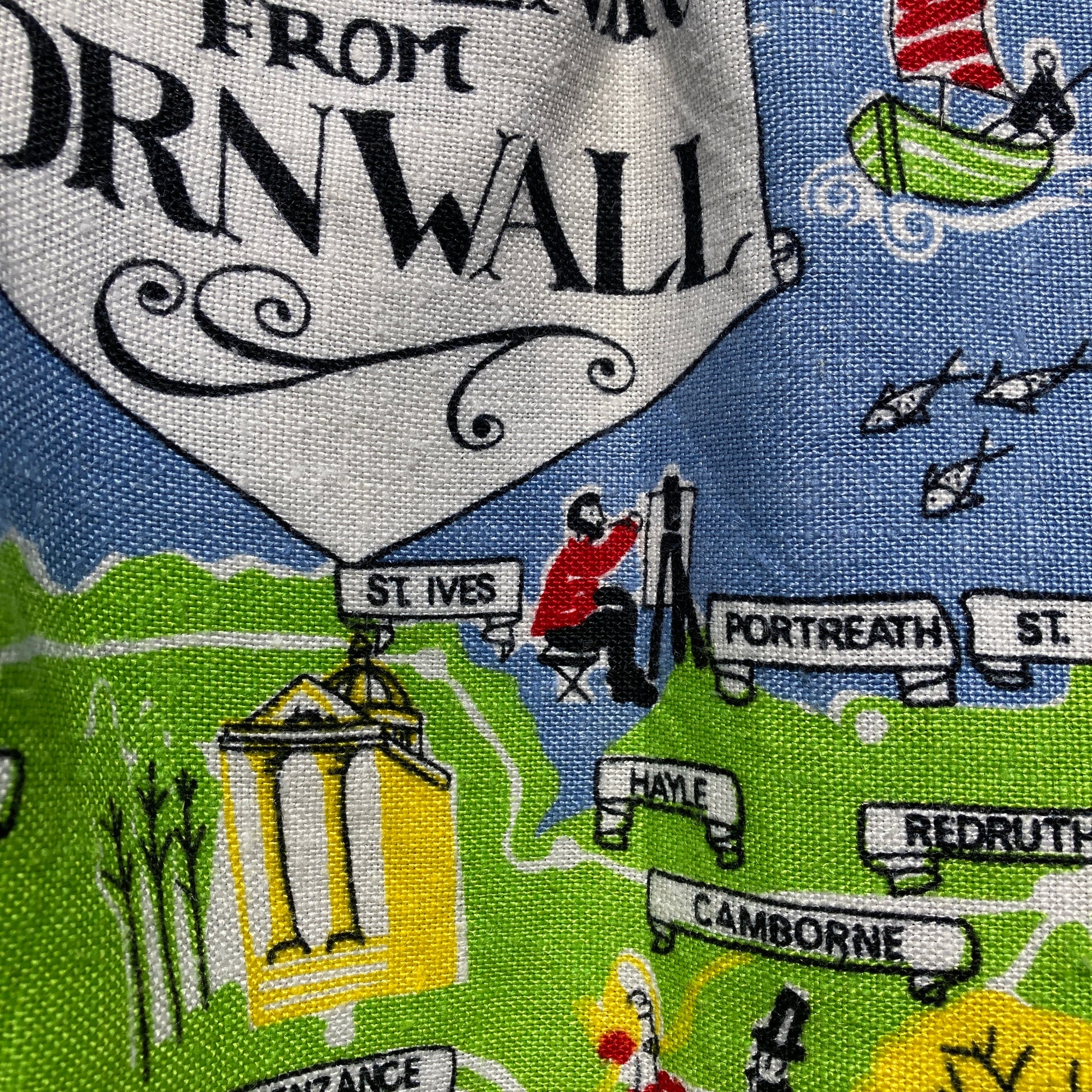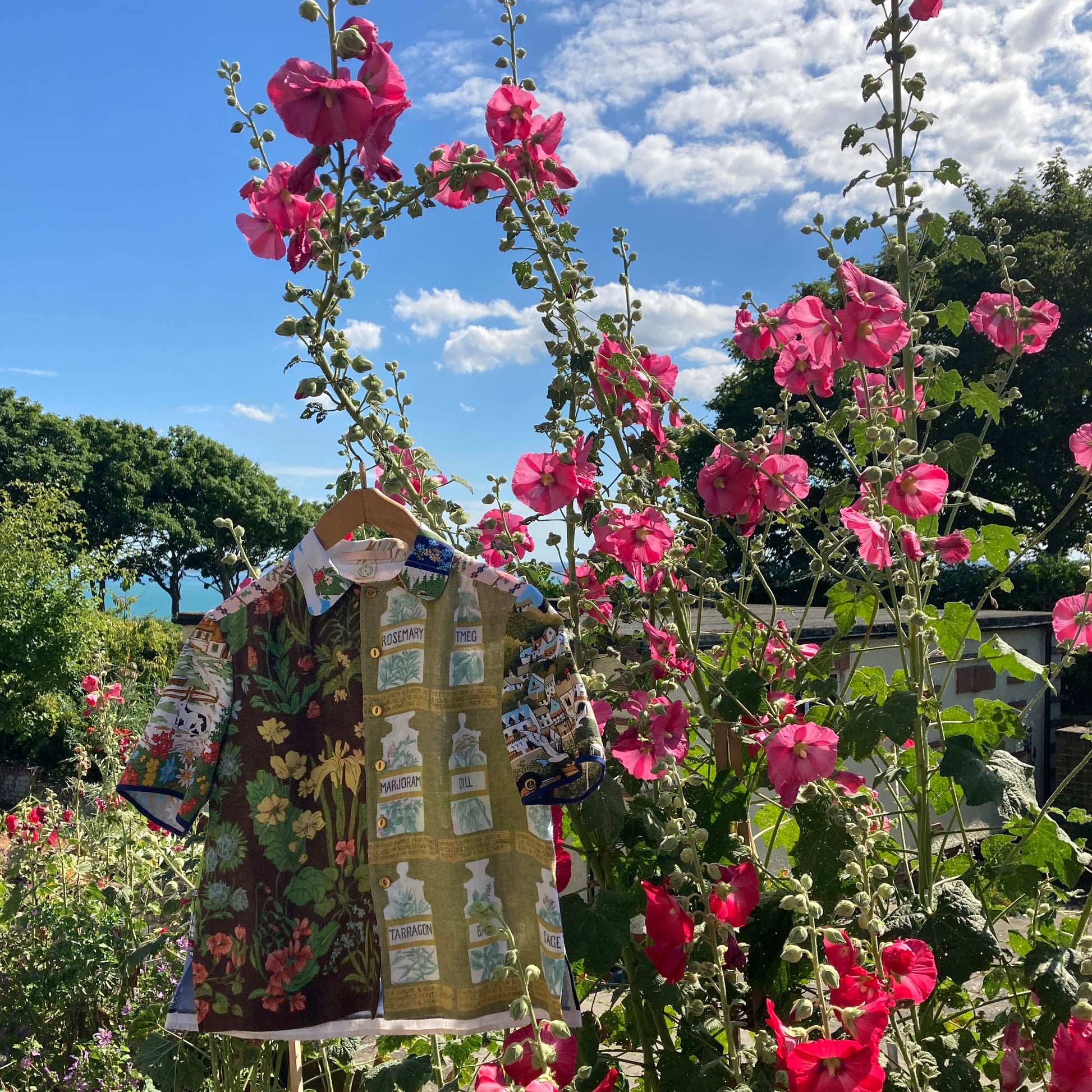The back is a Souvenir from Cornwall map featuring a St Ives artist, a pirate ship, a swimmer and lots of other illustrations. One side of the front is wild flowers and on the other is jars of herbs and spices. The yoke is a pink printed cross-stitch sampler and the sleeves feature printed flowers, a hillside town, a cow and an old-fashioned rucksack. On the collar are sky and clouds and a tiny log cabin.