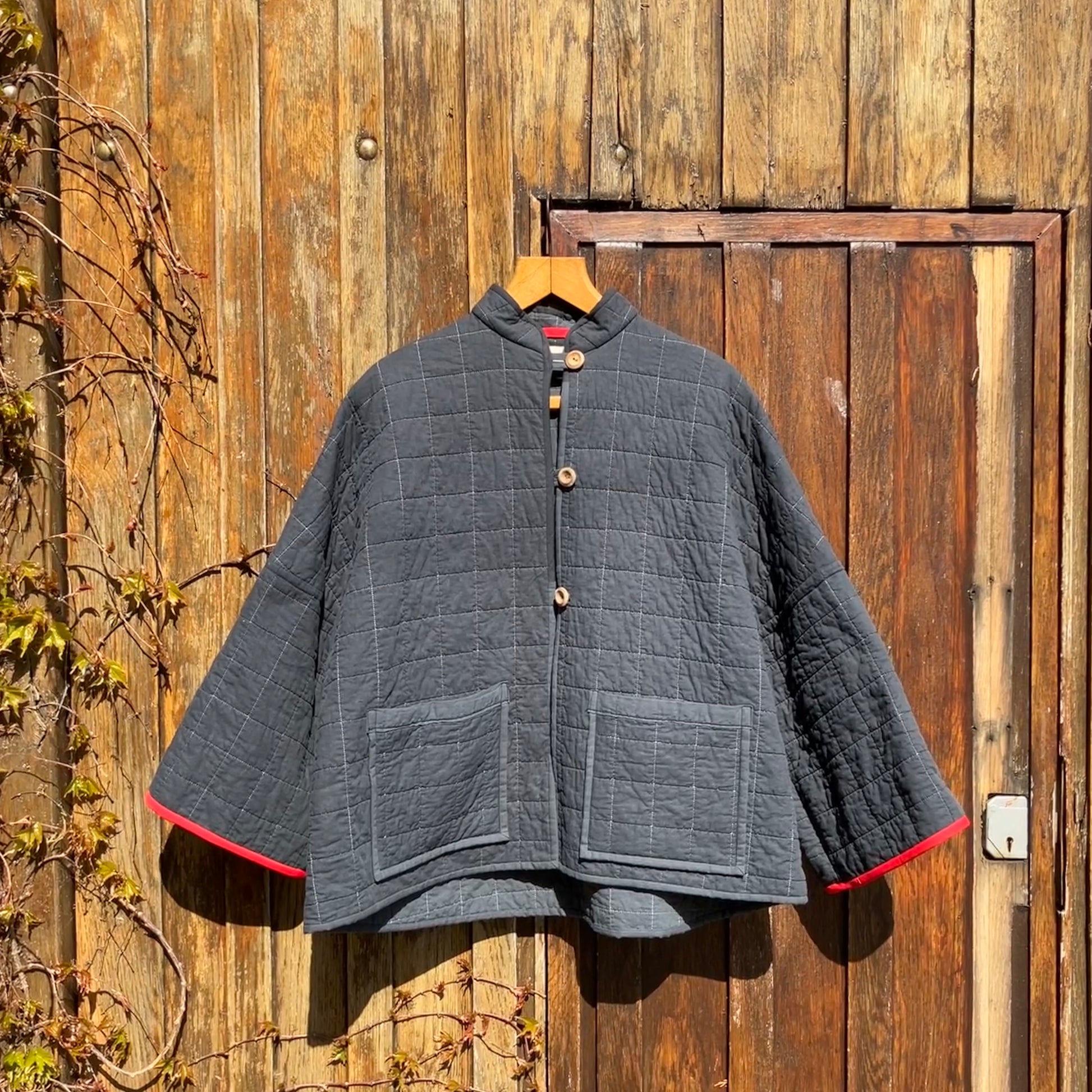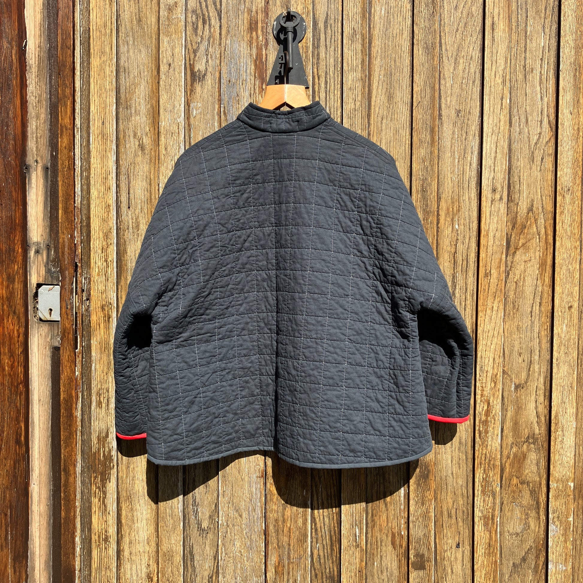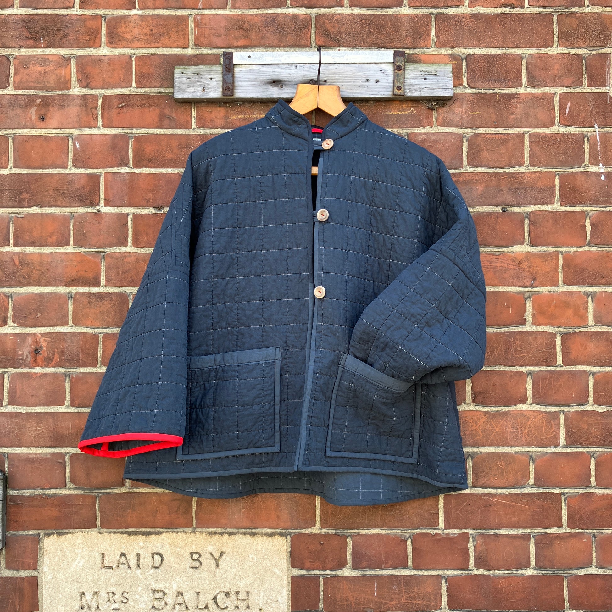 Jacket hand made from a reclaimed cotton quilt with grid pattern in off-white stitching.