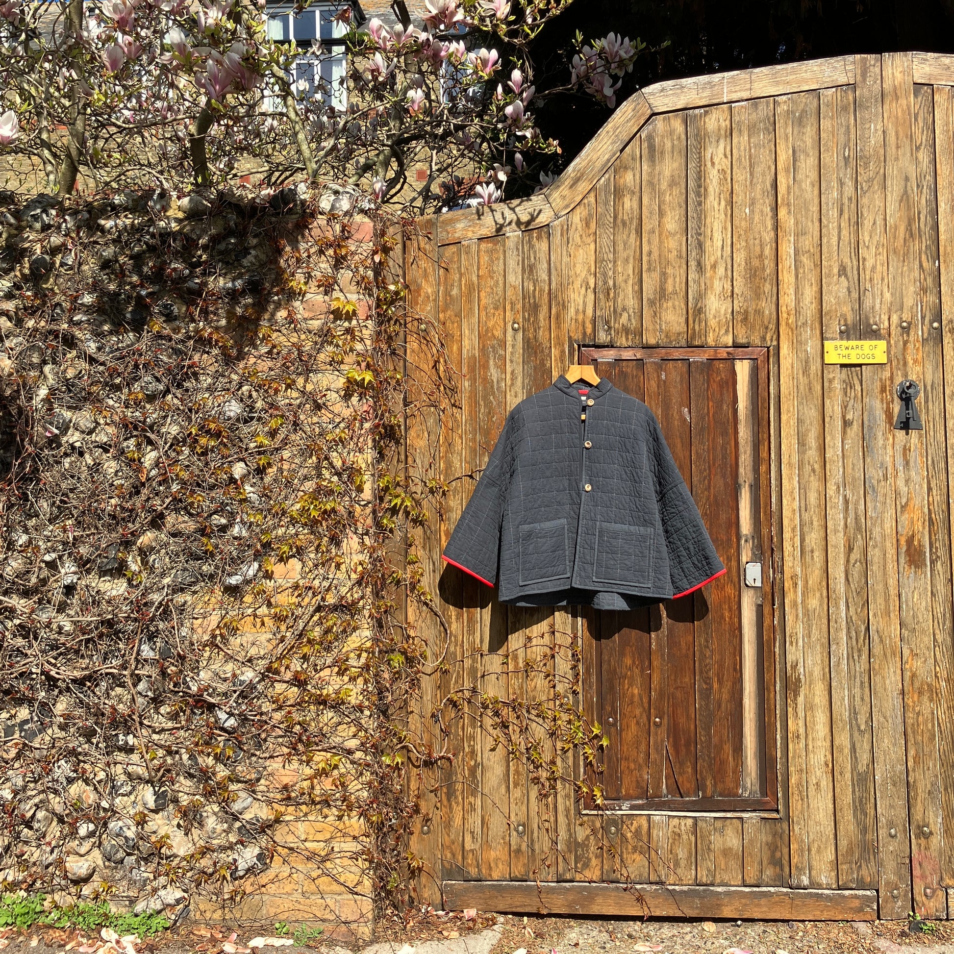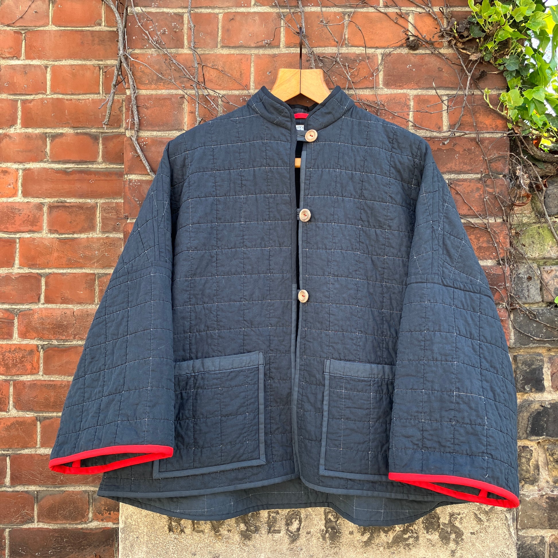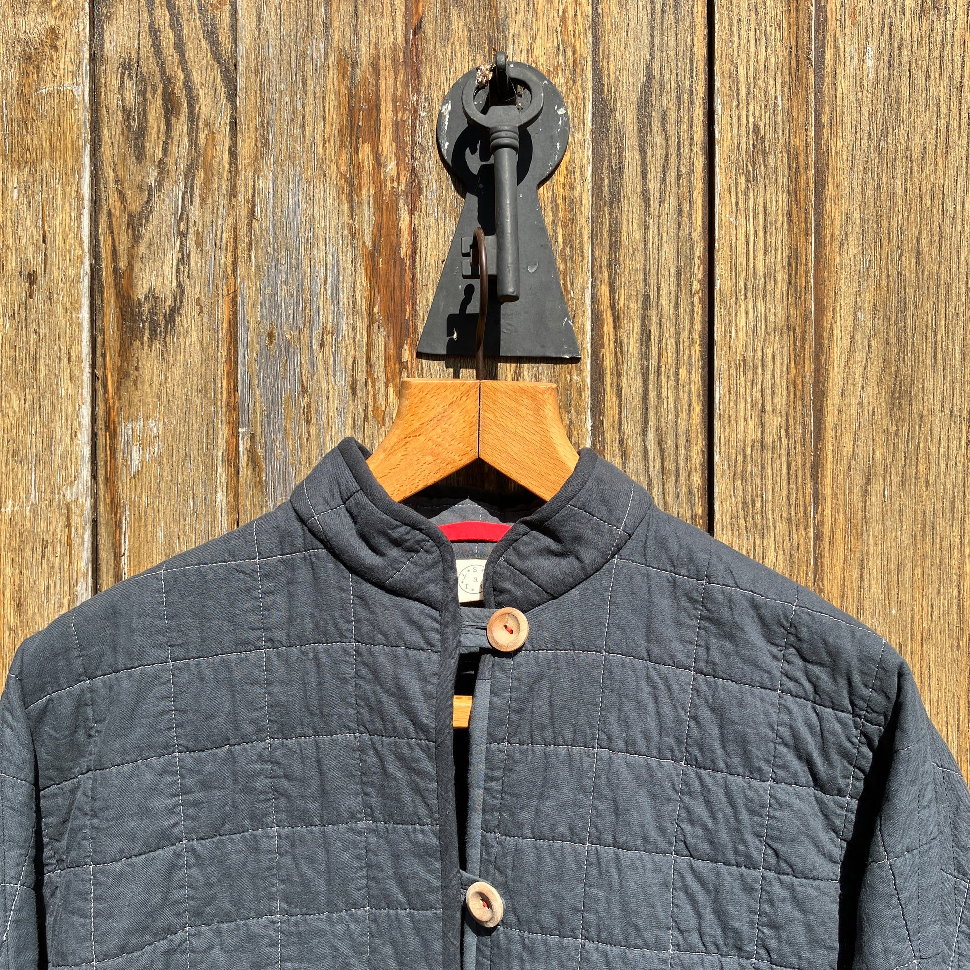 Jacket hand made from a reclaimed cotton quilt with grid pattern in off-white stitching.