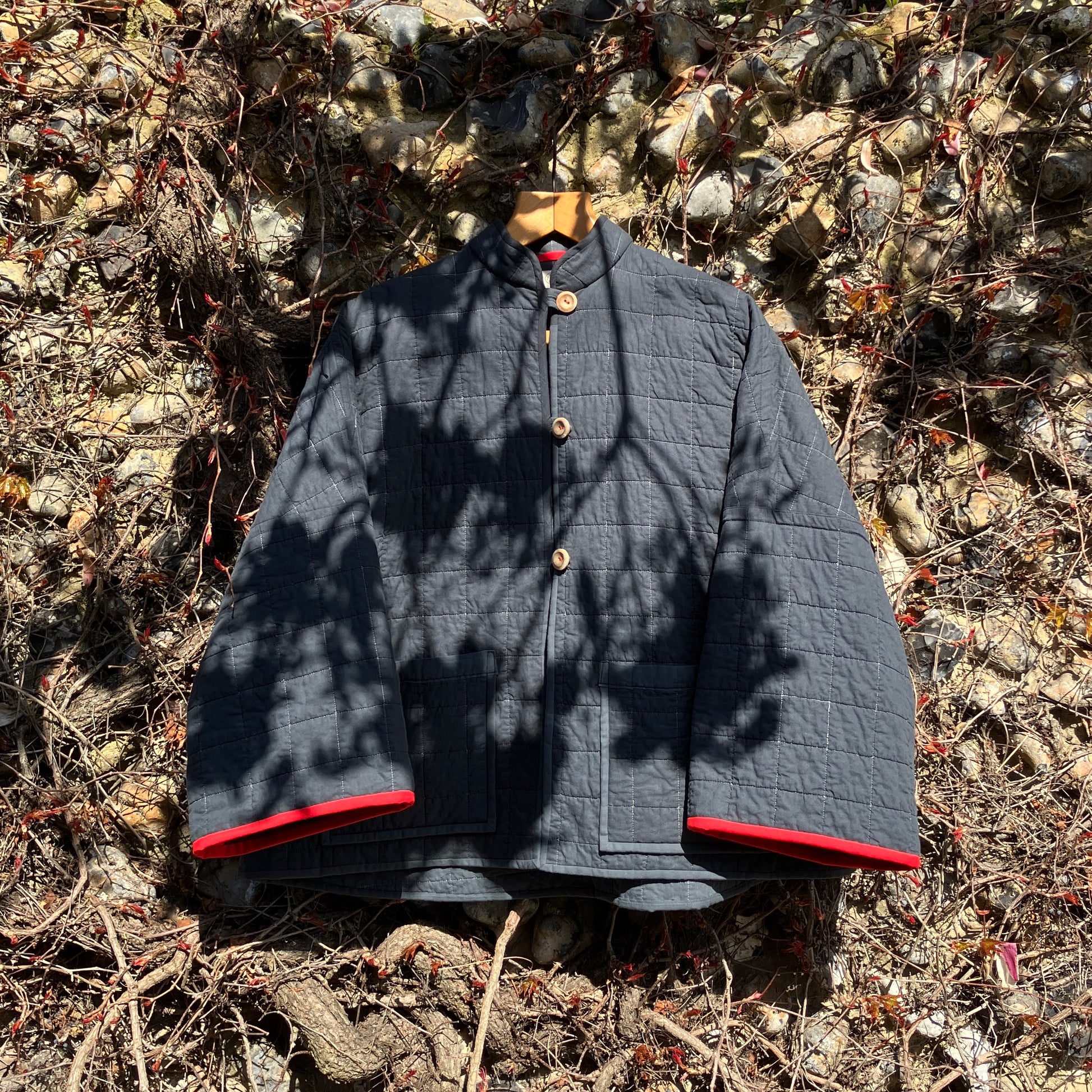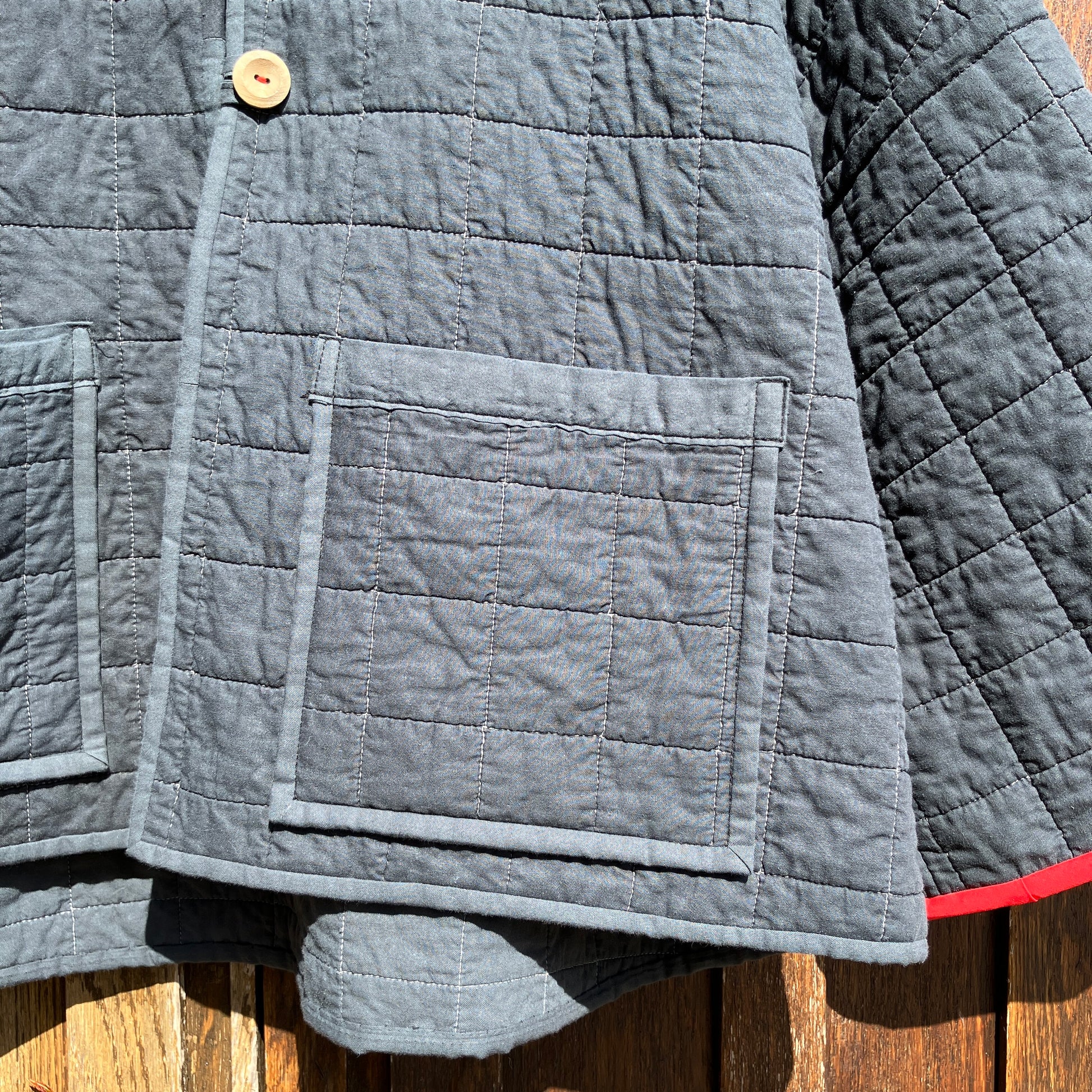 Finished with two patch pockets, a stand-up collar, found wooden buttons, binding harvested from the original quilt, plus reclaimed red binding around the cuffs.