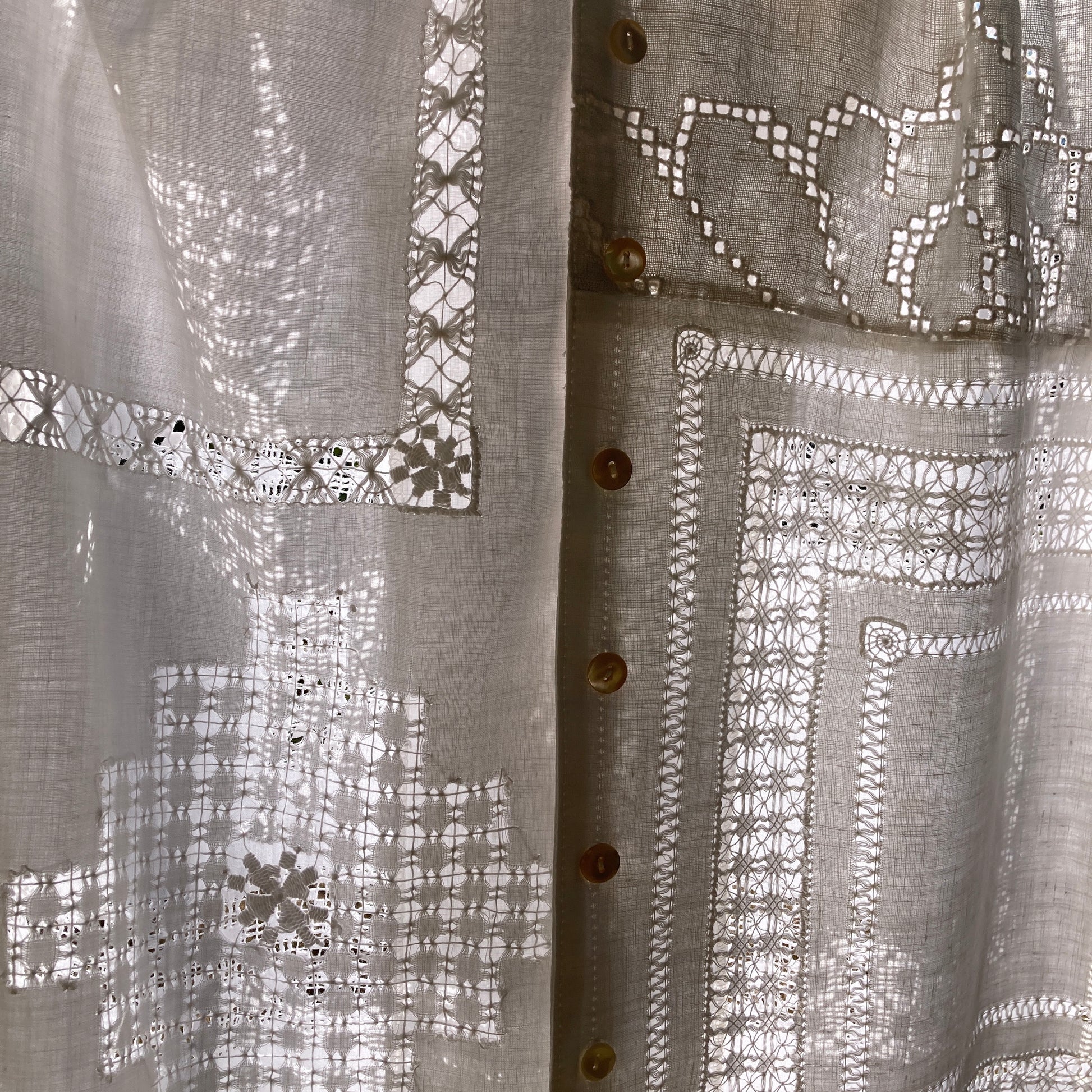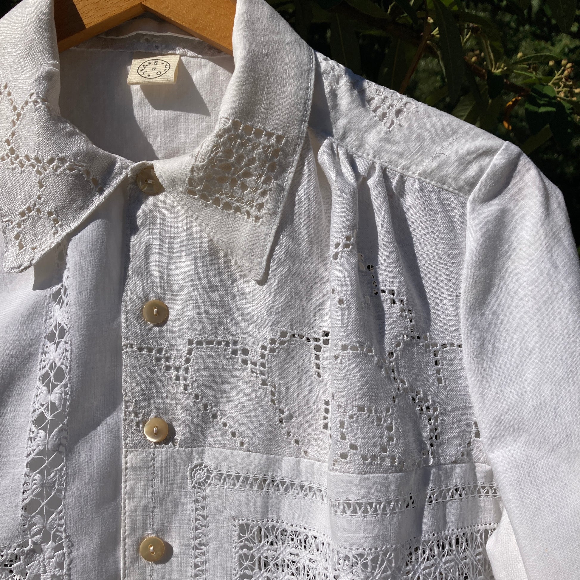 Cool and crisp short-sleeved shirt made from an assemblage of vintage white cutwork tablecloths, some cotton and some linen, with a big star on the back.