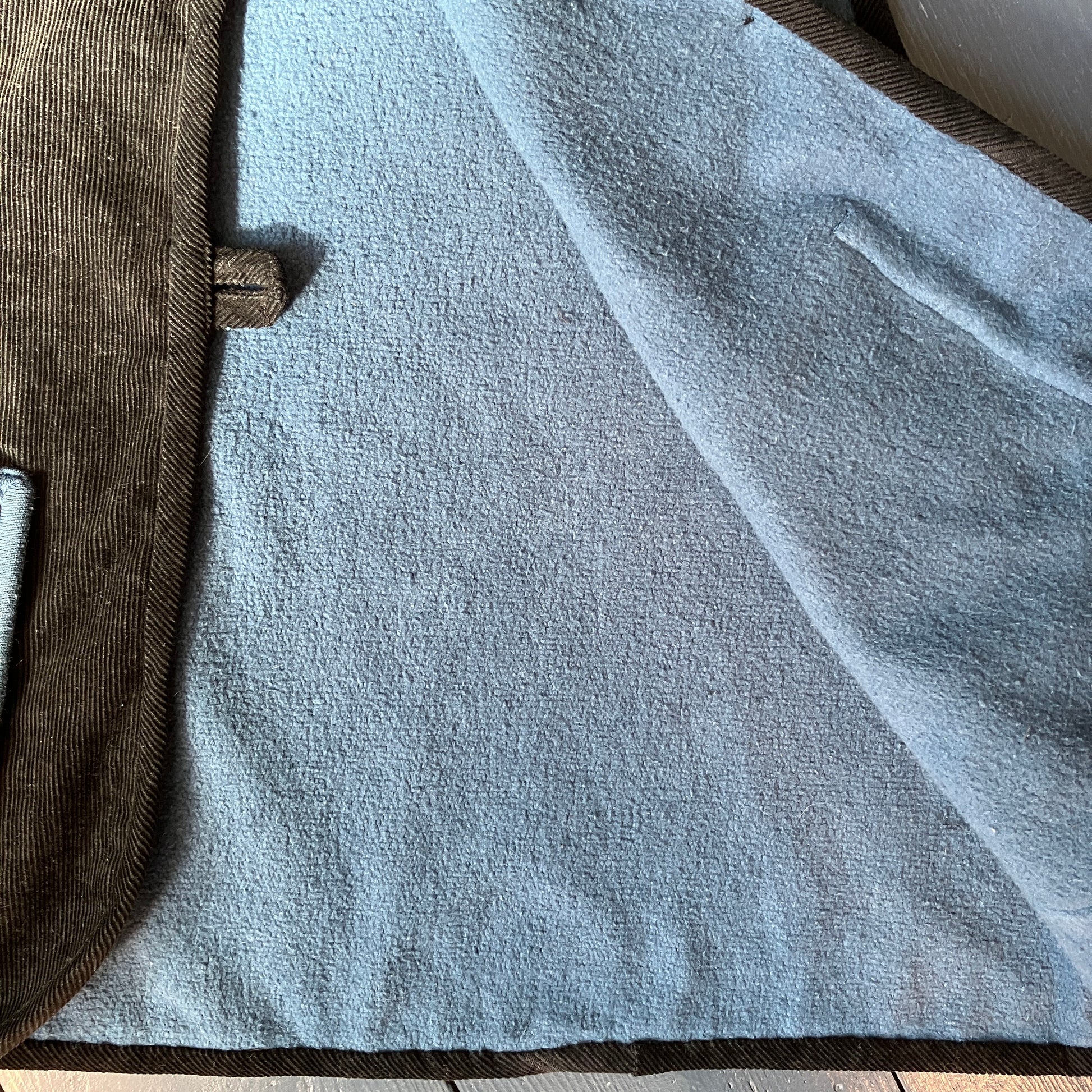 Lined with warm blue fleecy sweatshirt fabric. Finished with wooden buttons and a hanging loop.