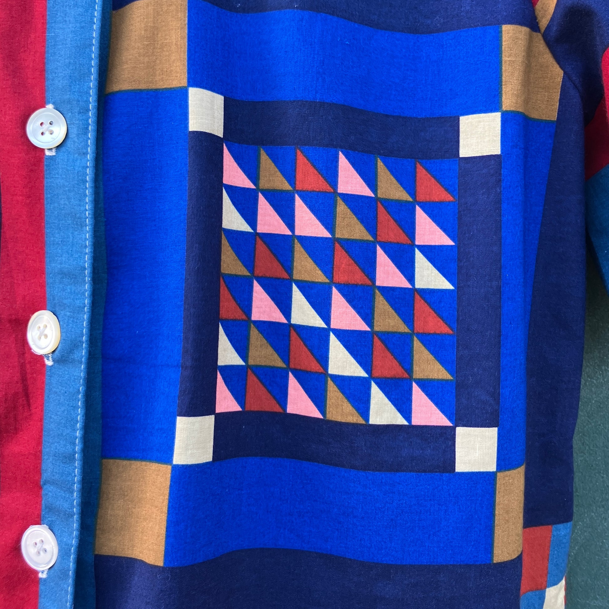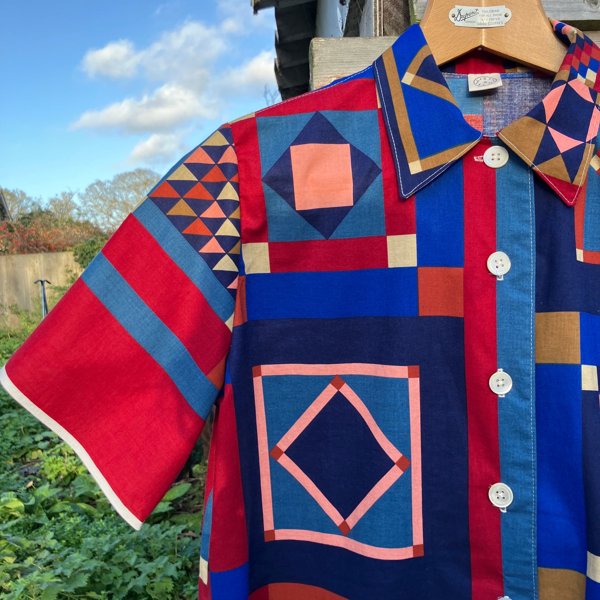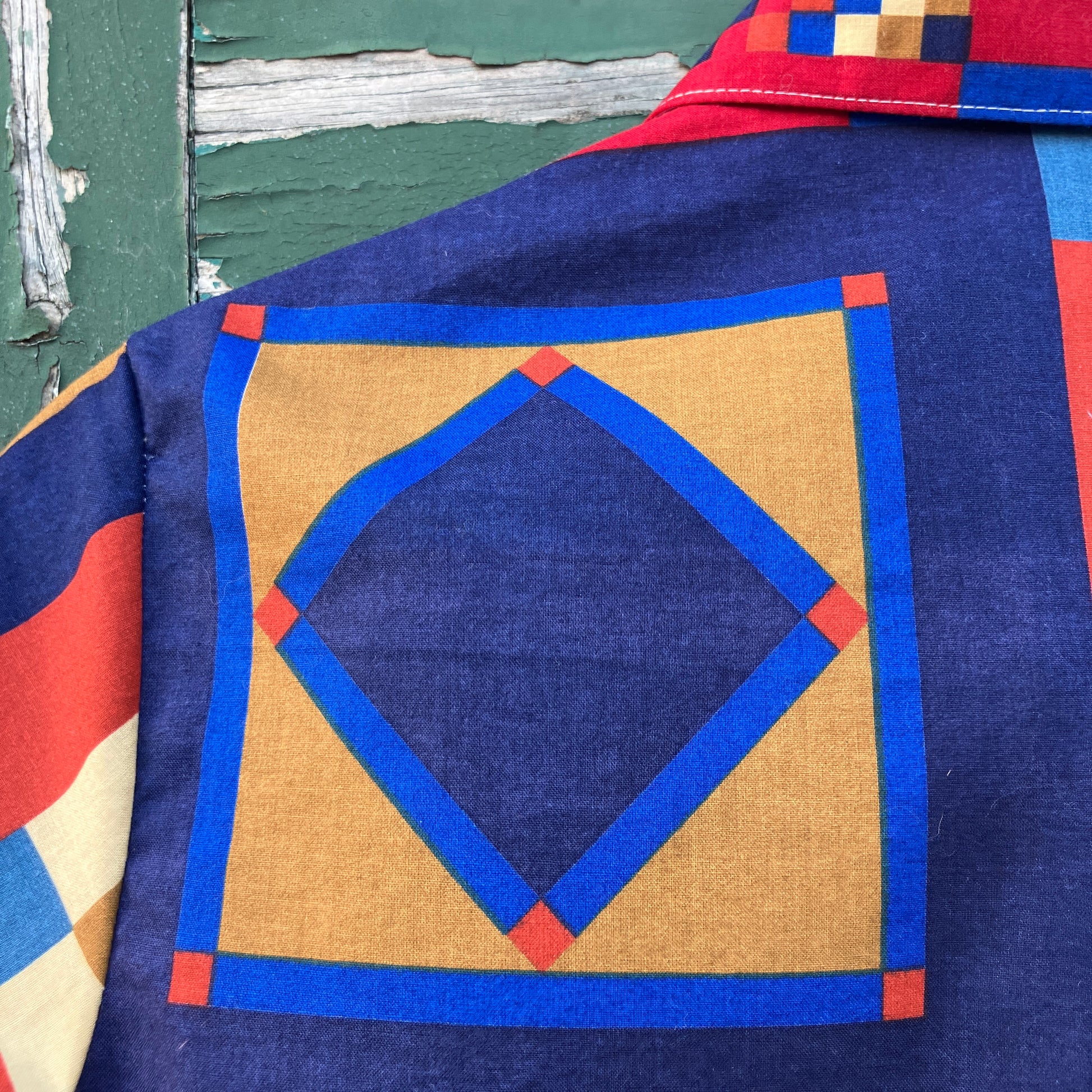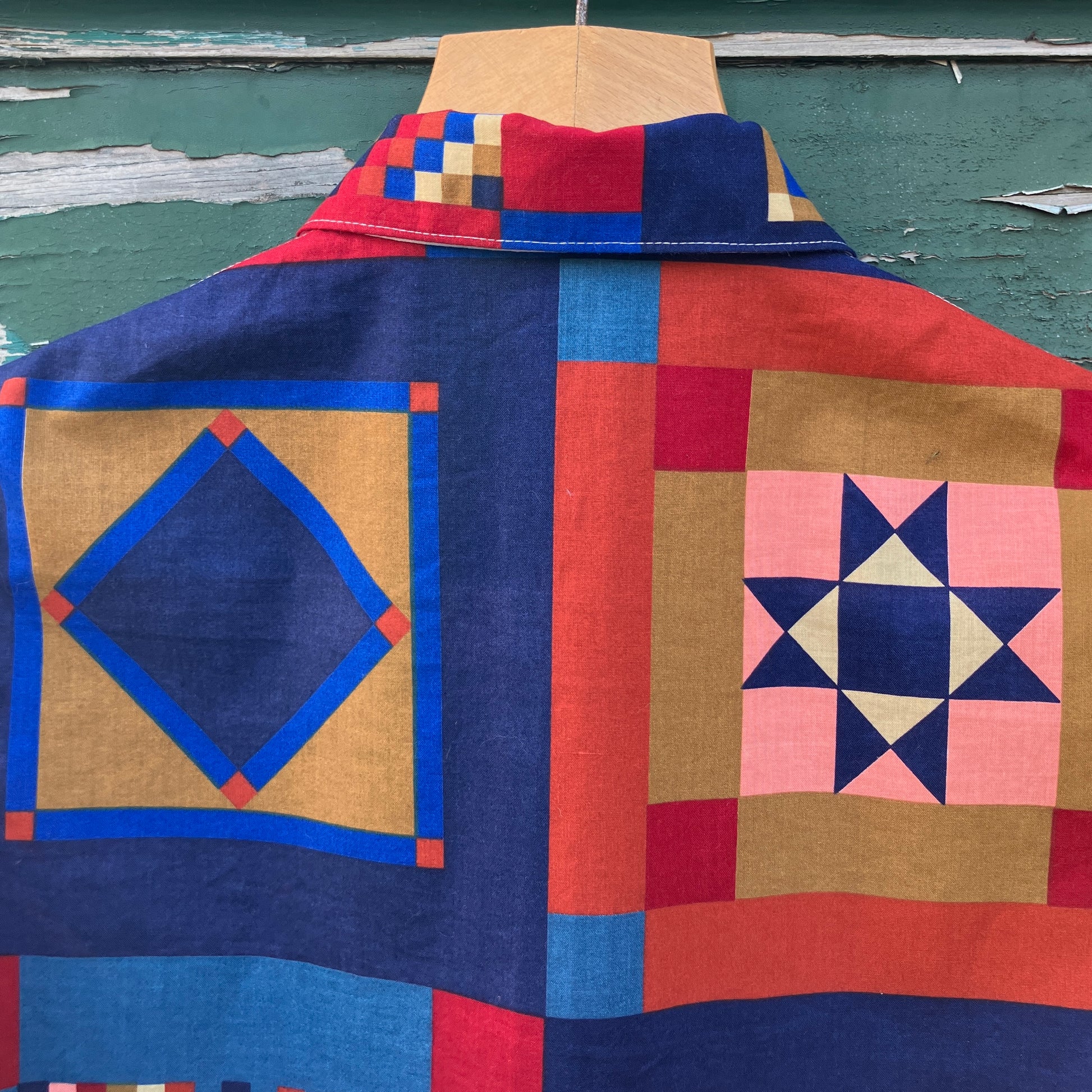 Simple, no-gathers shirt made from a panel of faux-patchwork-print cotton by Joan Kessler that I think dates from the 80s. I absolutely love all the colours and the details in the different patchwork blocks - no two the same.