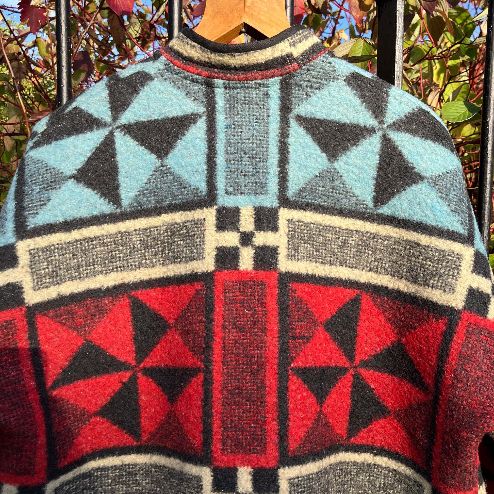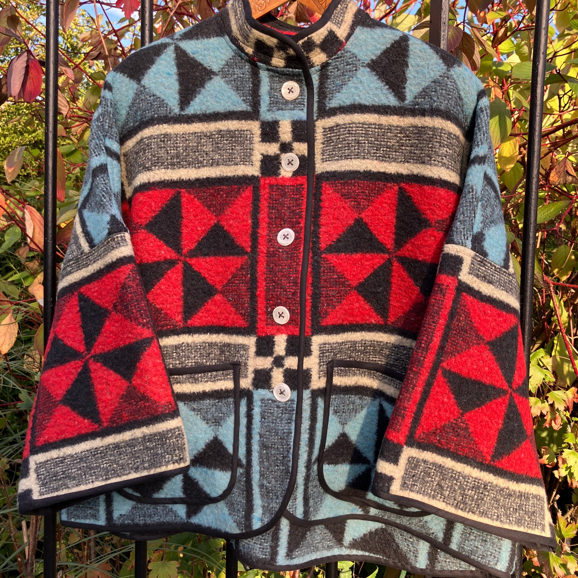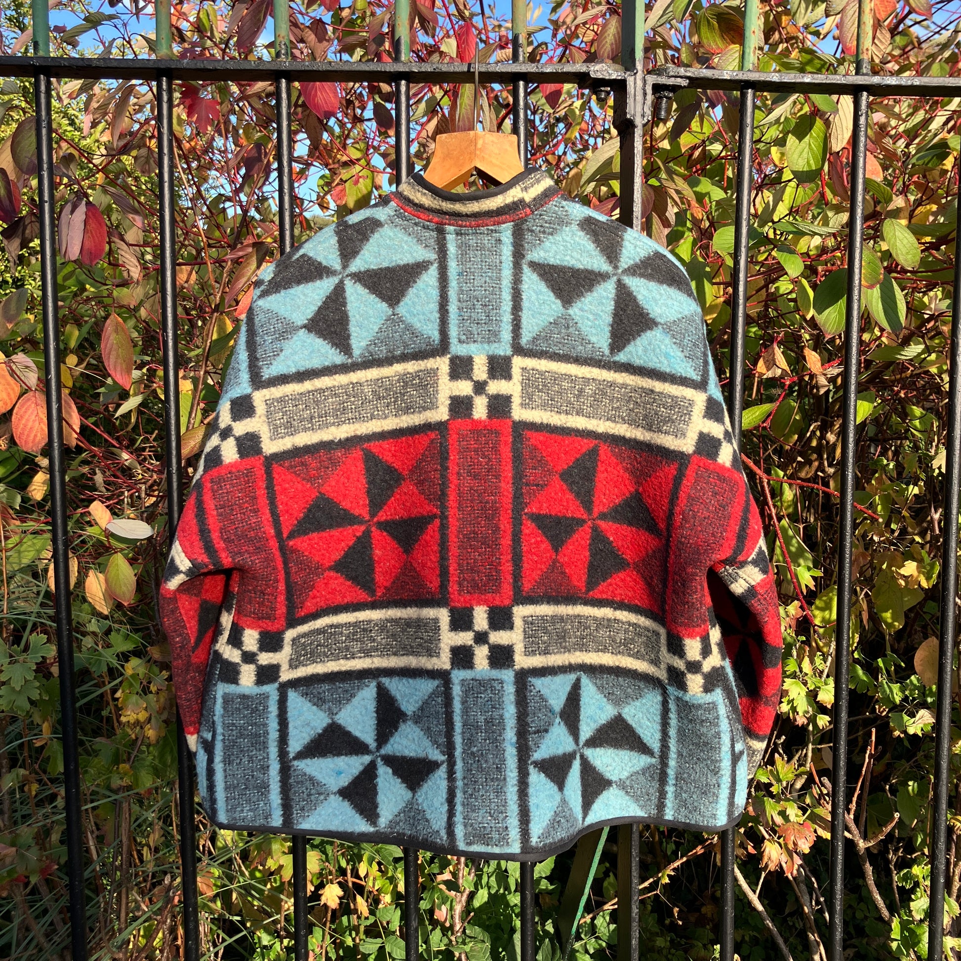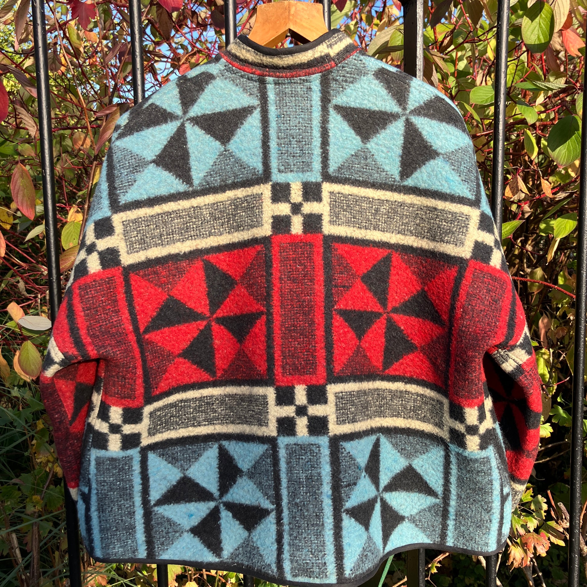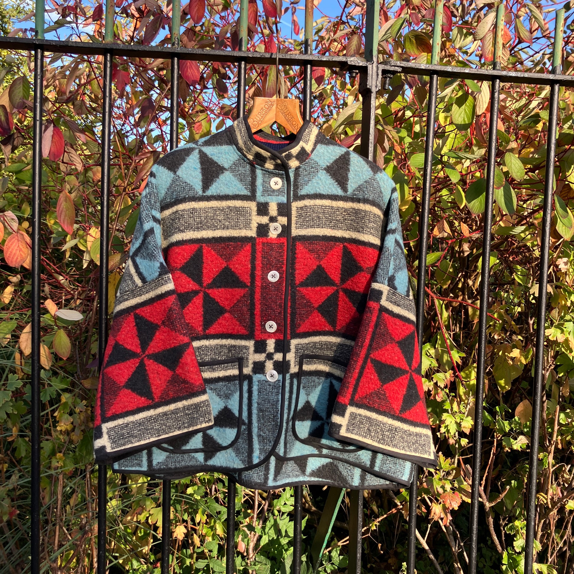 Cosy jacket made from a reclaimed patchwork-effect vintage blanket.