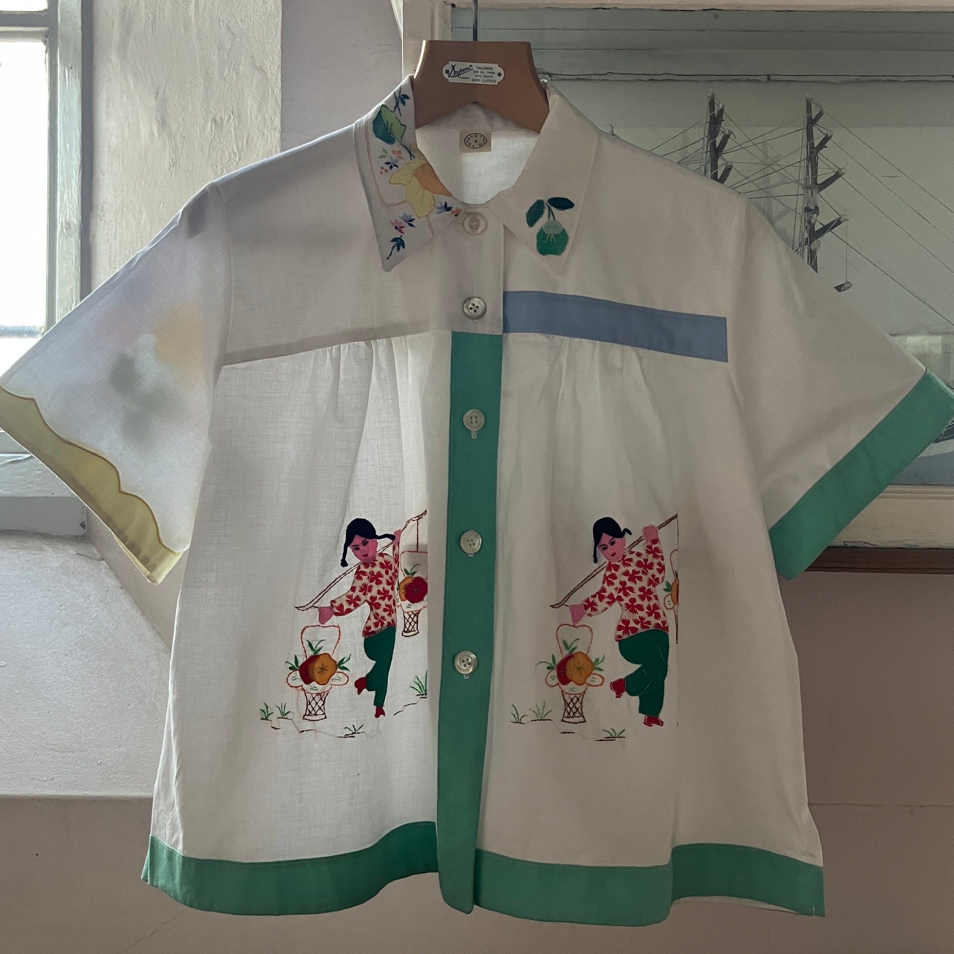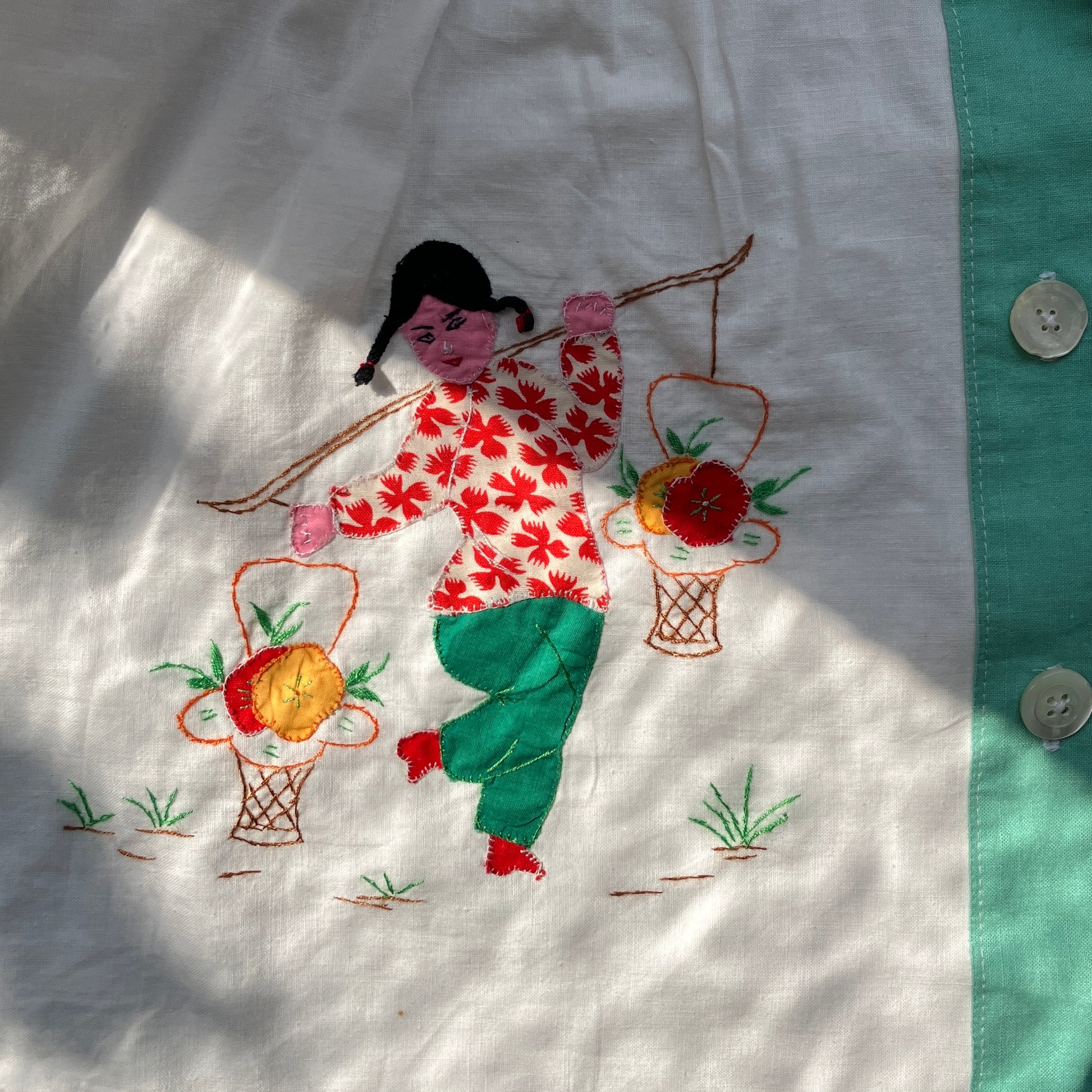 The green borders on the shirt came from the original pillowcases and just needed repositioning to run along the hems and up the button stand, and I found some complementary table linen in my stash with more borders and appliqué flowers which I used to complete the shirt.